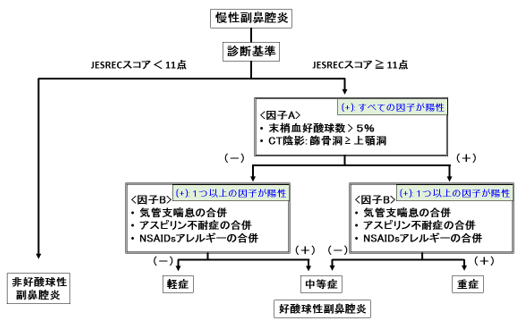 JESRECスコア11点以上というのは、症状から好酸球性副鼻腔炎を疑われる方の多くが満たすのですが、確定診断のための鼻茸組織中好酸球数(400倍視野)が70個以上というのが、なかなかクリアーできない場合があります。