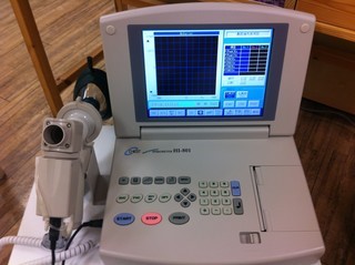 スパイロメトリーという喘息の診断などに用いる呼吸機能測定機に、鼻腔通気度検査用の測定装置を装着して行います。